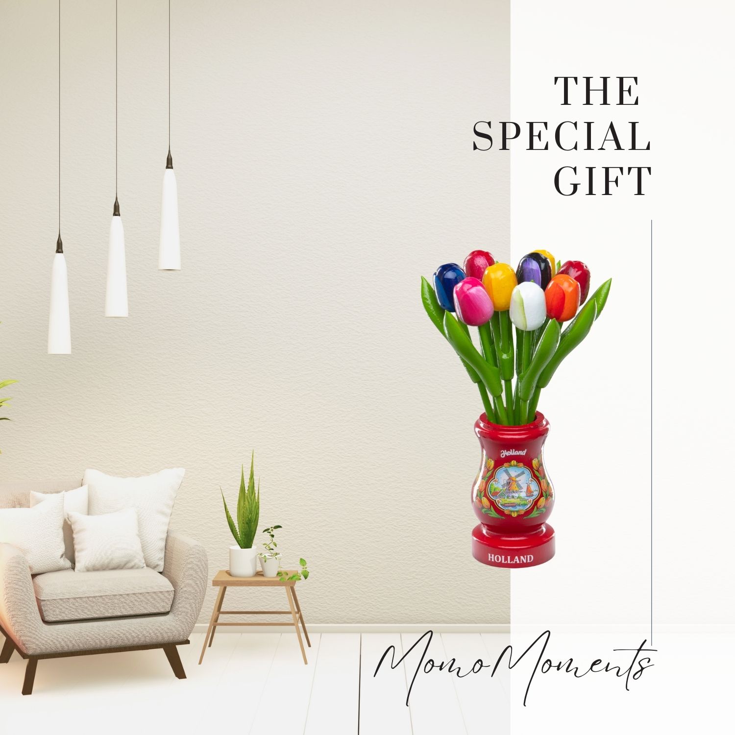 9 Holztulpen, 20 cm hoch in roter Holland Holz Vase mit Delfter-Windmühle, Tulpen handbemalt, Blumenstrauß, Dekoration, Made in Holland